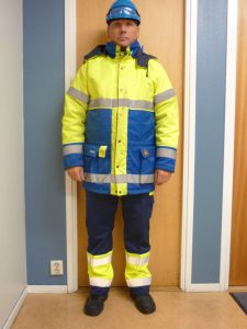 * = Alla Hall�ns chauff�rer skall ha en enhetlig gul/bl� kl�dsel av fluorescerande material enligt EN 471 klass 3 ute hos alla kunder (se bilden t.v.). Tillsammans med v�r leverant�r, Mercus Yrkeskl�der AB, Ring�gatan 12, 417 07 G�teborg har vi tagit fram en godk�nd sortimentslista. F�r att kunna h�mta ut arbetskl�der m�ste ni kontakta Utrustningsansvarig eller EPC p� kontoret.